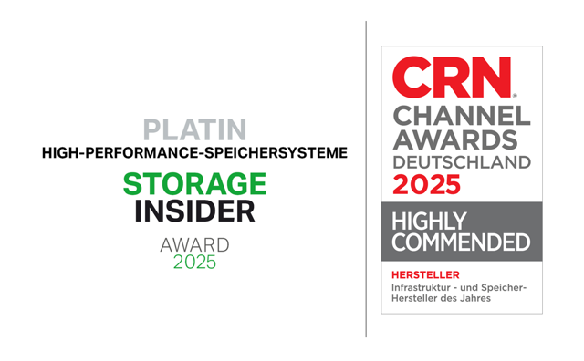Zum 9. Mal in Folge gab es Platin im Bereich High-Performance-Speichersysteme bei Storage Insider und den CRN Channel Award als Infrastruktur- und Speicherhersteller des Jahres.